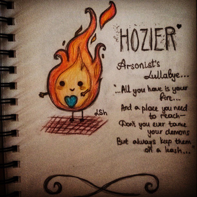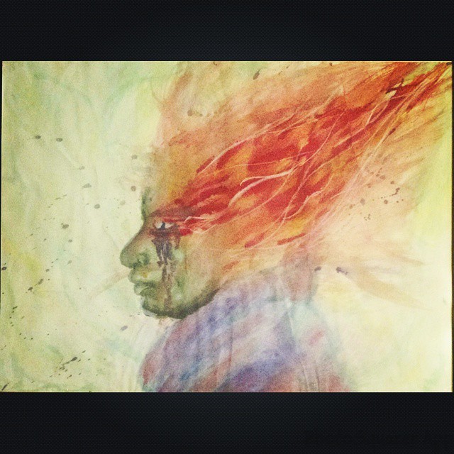 It’s called “Arsonist’s Lullaby” based off the song by Hozier. Essentially, I was attempting to capture the idea that people can have addictions or secrets about them that slowly eat them away and are often nothing like the person appears (hence the vast difference in the green face and the flames). I wanted it to be really strong and bold lines and colors, but it came out faded and soft. As someone pointed out to me, it almost portrays my theme better, though. For one, it’s soft like a lullaby like the title indicates and the softness adds to the idea that addictions are often very subtle and hidden.